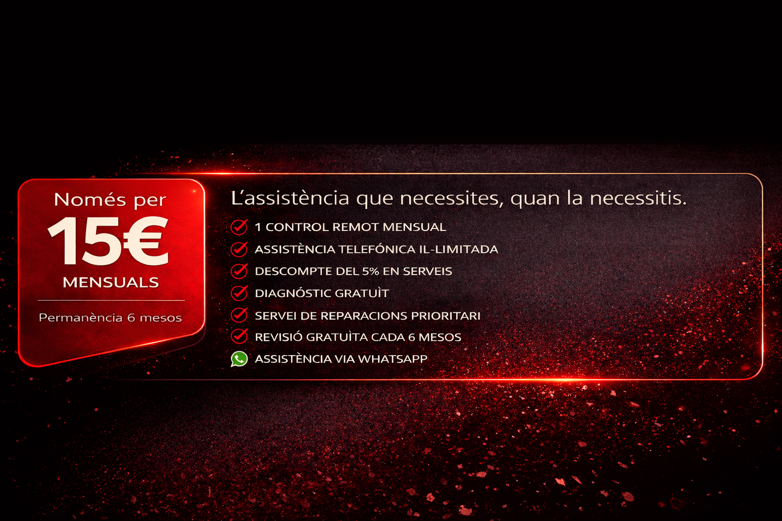 Inclou assistència remota mensual, assistència telefònica il·limitada, prioritat en reparacions, diagnòstic gratuït, revisió semestral, participació en sortejos i suport via WhatsApp.